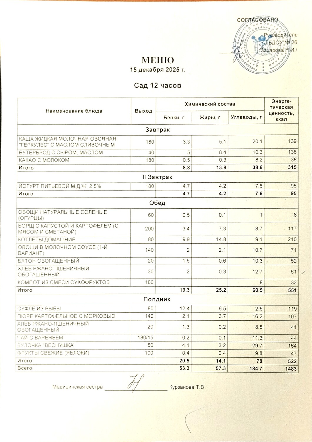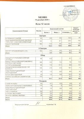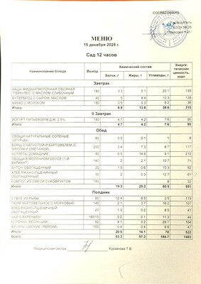 - ежедневное меню основного (организованного) питания на сутки для всех возрастных групп детей с указанием наименования приема пищи, наименования блюда, массы порции, калорийности порции;